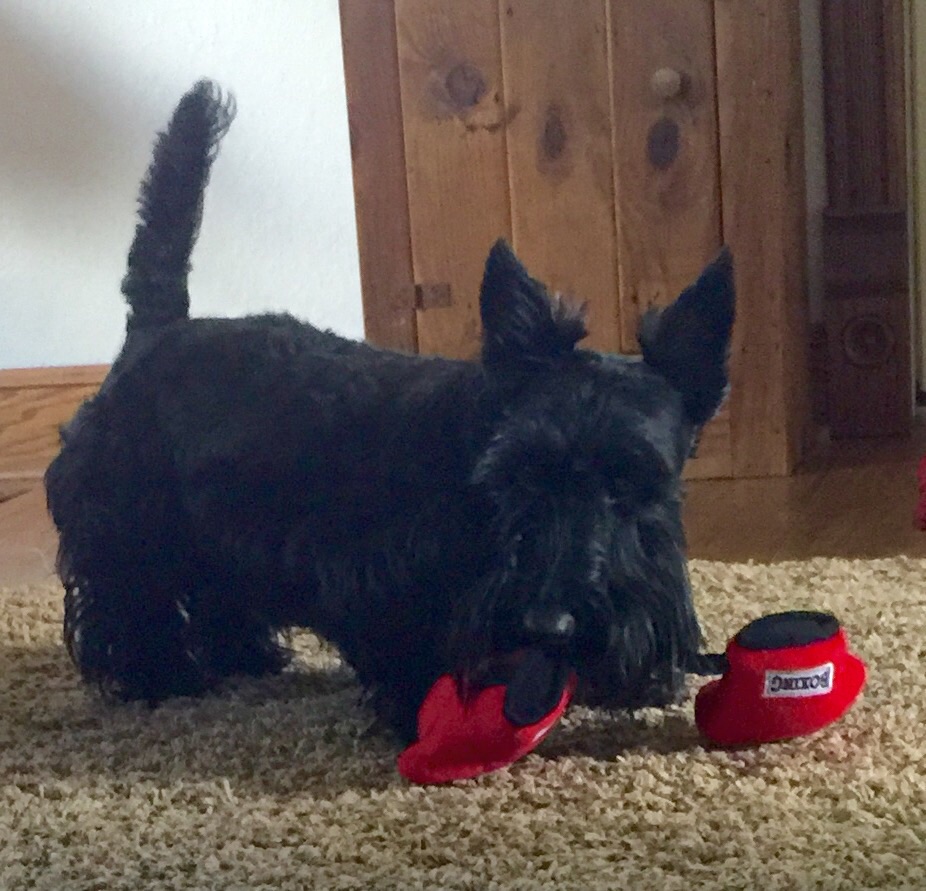 We got our monthly delivery from Barkbox this week. It had the cutest little pair of boxing gloves in it; I immediately loved them and, of course, Brother did too. We are like this with any toy. I don’t care if there were ten of them; we always want the toy that the other is playing with. It’s the Scottie way, Mom says.