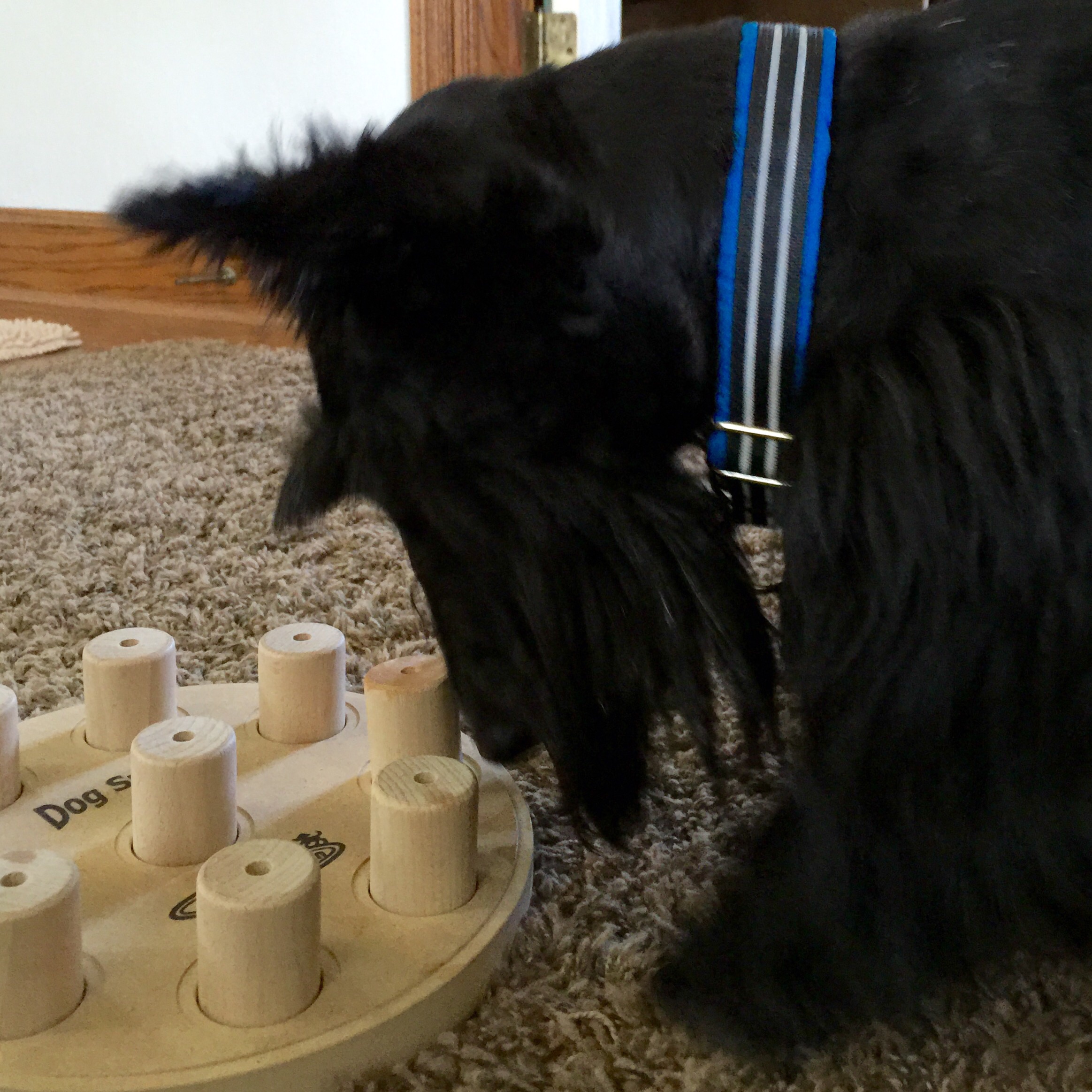 Nina Ottosson dog puzzles can be purchased online from Amazon in many styles and difficulty levels.  It is good for dogs of all ages even young pups just learning commands.