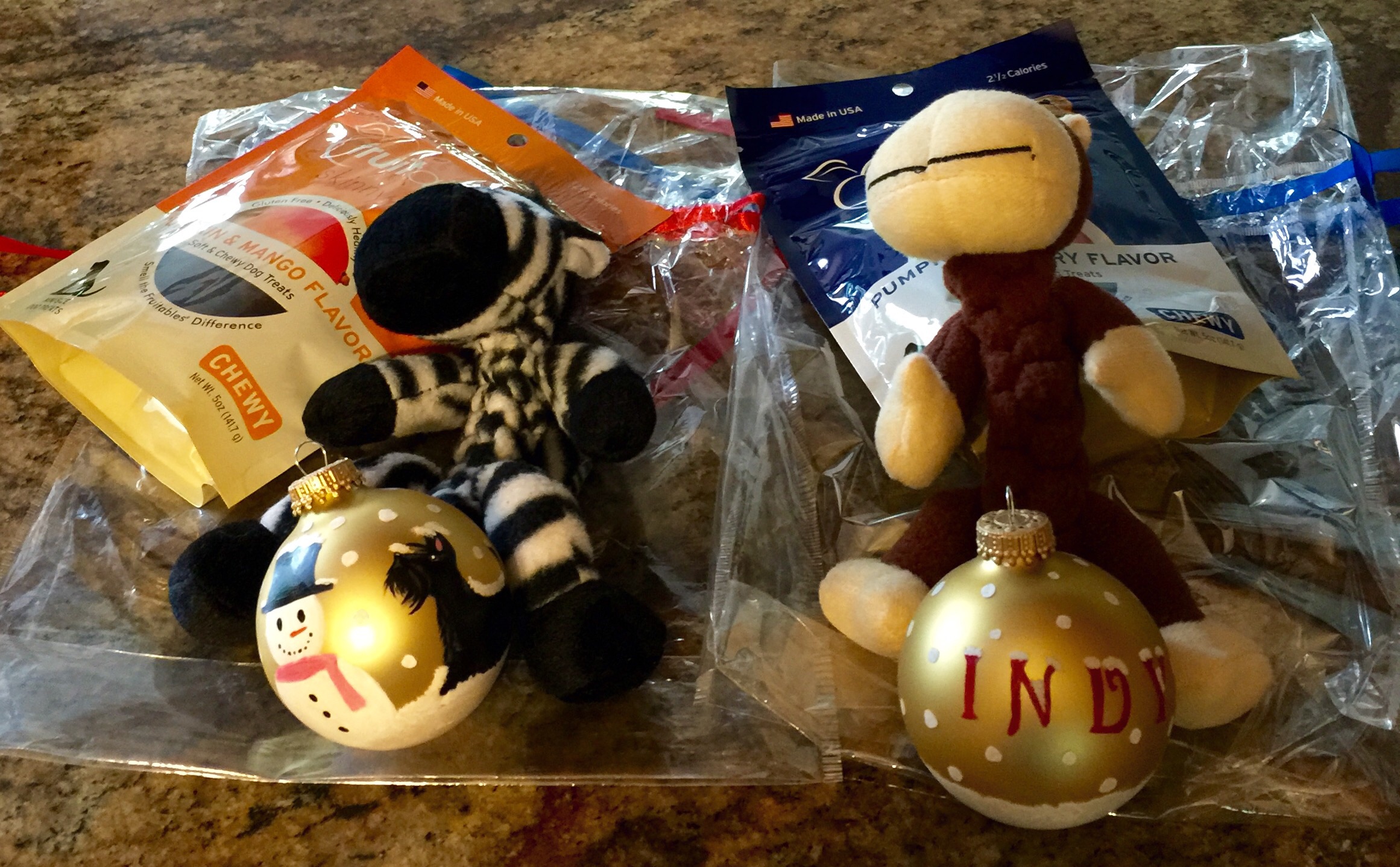 She gave us treats, toys and these wonderful Christmas ornaments by Manna Nelson. They have snowmen, Scottie and our names on them. Love!